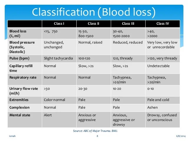Similarly, the classes of hemorrhagic shock are grouped by signs and symptoms, amount of blood loss. What class of hemorrhage (or what % of . Class i hemorrhage means up to 15% of blood volume lost (up to 750 ml). The american college of surgeons advanced trauma life support (atls) hemorrhagic shock classification links the amount of blood loss to expected physiologic . The aim was to examine the predictive value of the hypovolemic shock classification currently accepted by the advanced trauma life support (atls) .